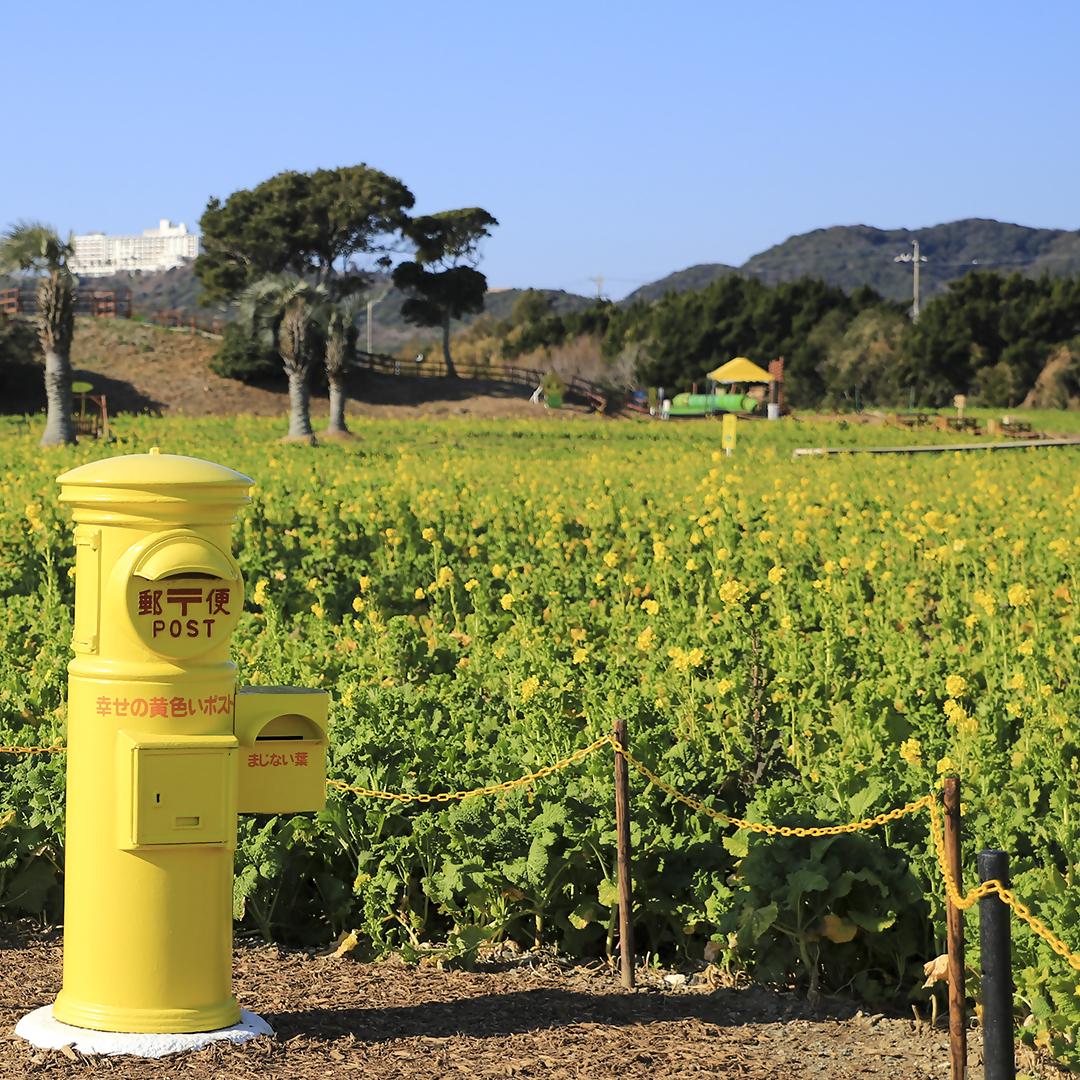 幸せを呼ぶ黄色いポストや菜の花ランウェイなど人気のフォトスポットが数多くある。菜の花グルメも楽しむことができ、のっちの丘からは菜の花畑を一望できる。