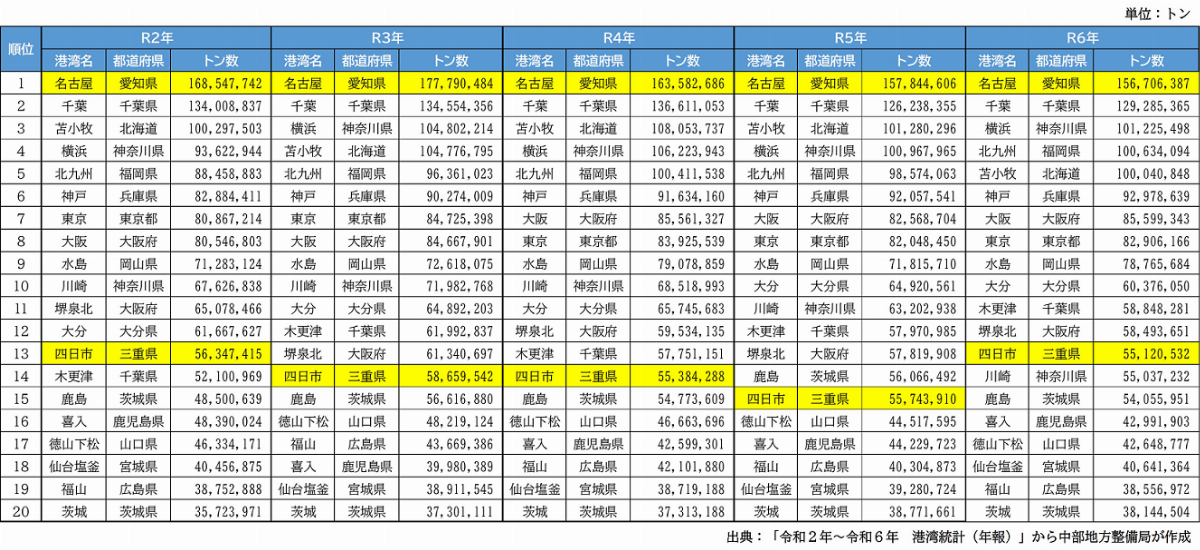 ・名古屋港は連続で1位を記録している。 ・四日市港も上位20位に連続でランクインしている。
