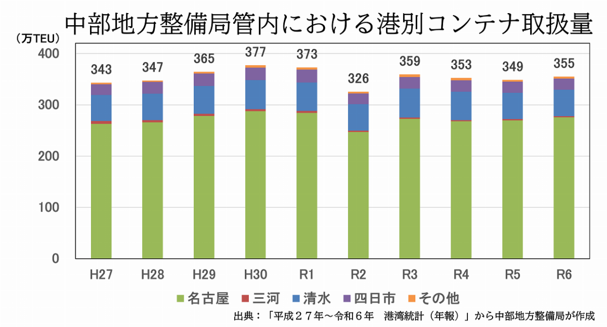 ・中部管内のコンテナ取扱量は、350万TEU前後で推移している。 ・取扱貨物量と同様に、名古屋港のコンテナ取扱量が中部管内で最も多い。 ・新型コロナウイルスの影響により令和2年に減少したが、令和3年に回復している。